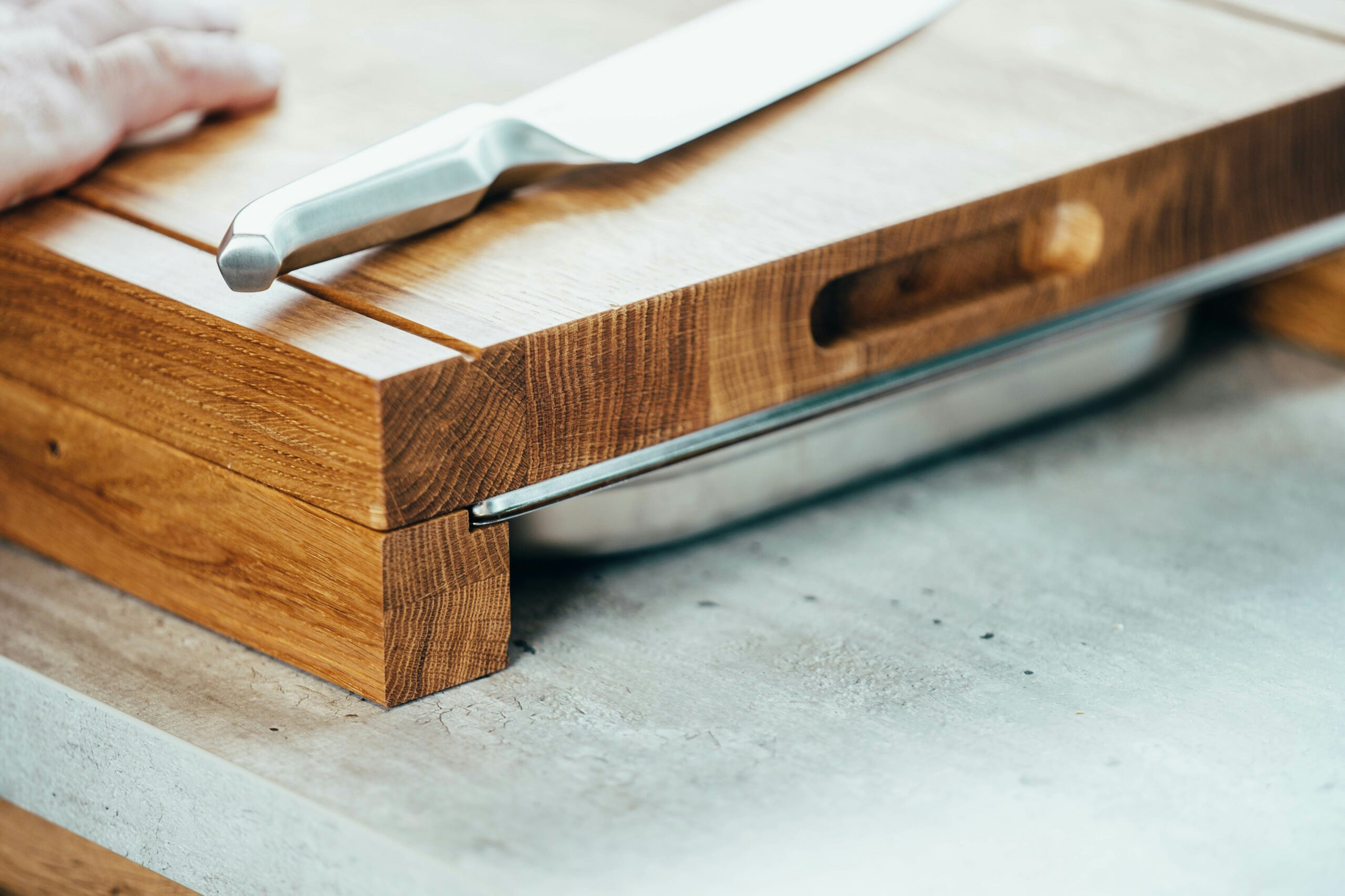 In der Fertigung werden hochwertig ausgesuchte luftgetrocknete Eichenbohlen für jedes Schneidebrett per Hand zugeschnitten, gehobelt, verleimt, CNC gefräst und fein geschliffen. Anschließend werden unsere Z-Serien Cuttingboards mit unserem lebensmittelechten, zertifizierten und umweltfreundlichen Öl eingelassen und versiegelt.